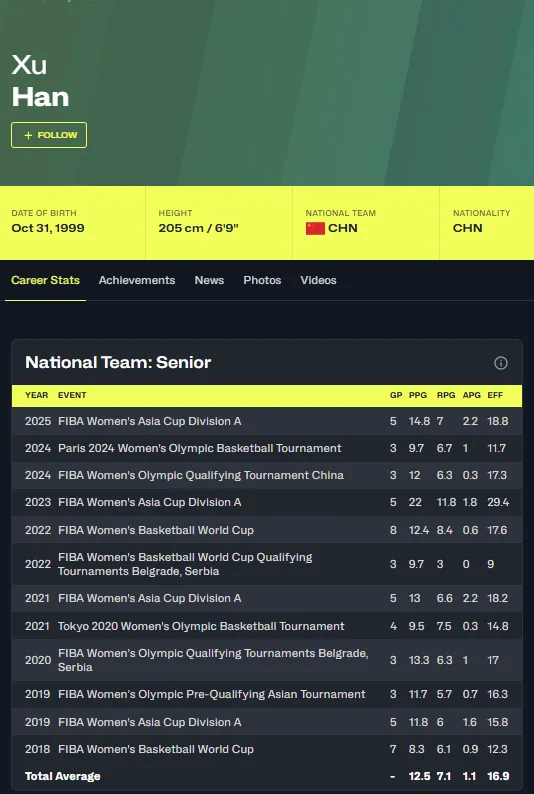22年以来第一个被WNBA球队选中的中国人,也是被WNBA球队选中最年轻的中国人,被纽约自由人队选中时,韩旭仅19岁。