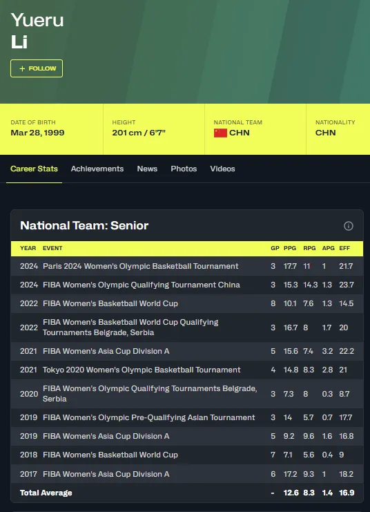 李月汝在WNBA征战了两个赛季,2022年,李月汝代表芝加哥天空队出战16场比赛,场均出场5分钟,得到1.8分1.5篮板0.1助攻。